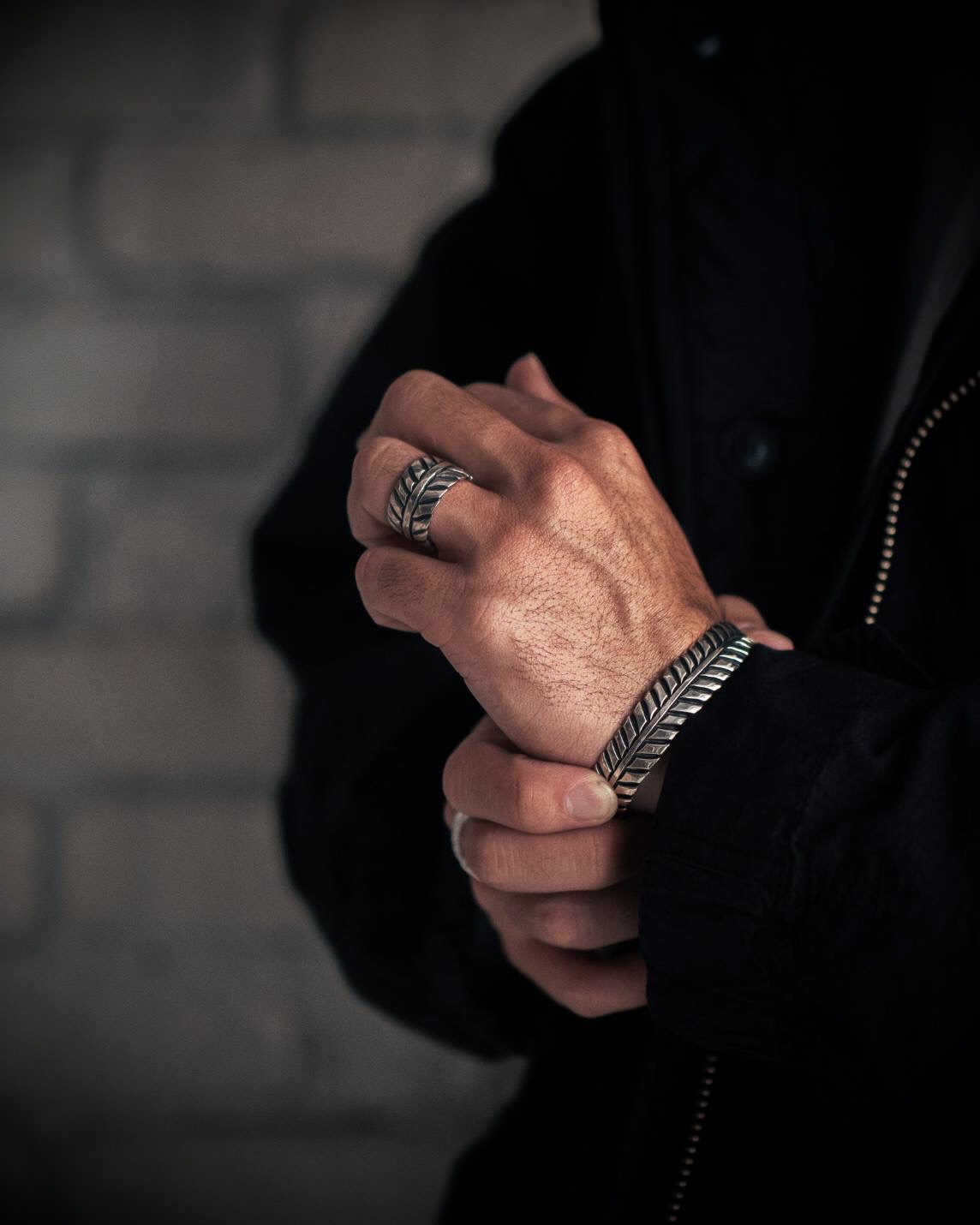 鑽という先端に刃先を持つ工具で溝を打ち、フェザー調に仕上げたバングル。
